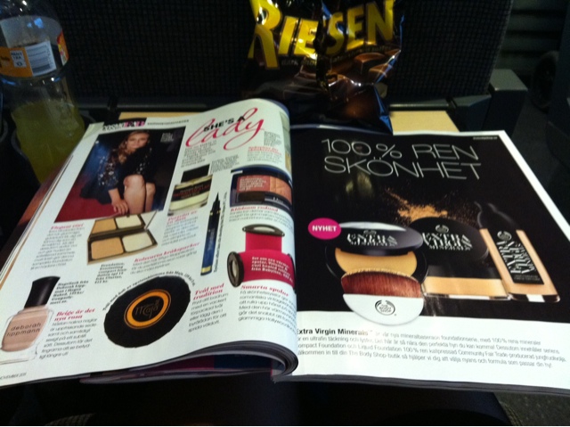 Sitter jag på tåget som tar mig mot Stockholm :) de är en lång resa, 2 o en halv timme kvar! Kommer direkt att åka hem till Lina, ikväll ska det drickas vin;) köpte med mig nya cosmo på tåget! Sitter just nu o ska läsa vidare :) hörs sen.